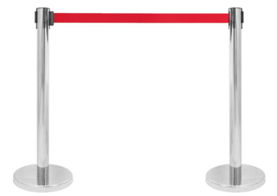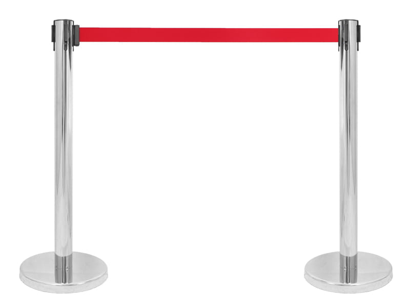 Słupki z taśmą odgradzającą (SW90TS): Eleganckie słupki chromowane z automatycznie zwijaną taśmą o dużej długości.