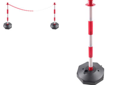 Słupki wygrodzeniowe do łańcucha: Wyposażone w stabilne, dociążane podstawy (często z możliwością napełnienia wodą lub piaskiem) oraz głowice umożliwiające szybkie zapięcie łańcucha z tworzywa sztucznego. Idealne do wyznaczania ciągów komunikacyjnych w magazynach.